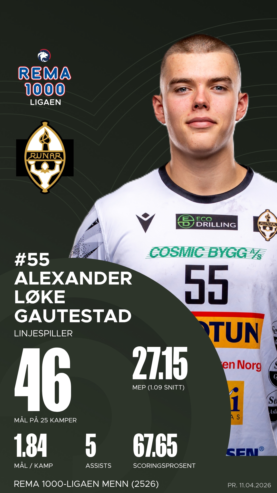 Christoffer Rambo var Runars mest effektive spiller denne kvelden med ni mål og tre målgivende pasninger. Han var en konstant trussel fra høyre bakposisjon. Daniel Gillis Lennart Blomgren leverte også en sterk kamp med åtte scoringer og flere viktige assists. Tord Lea Knutsen var motoren i laget og sto bak mye av det gode angrepsspillet, mens Alexander Løke Gautestad viste styrke og timing på linja.